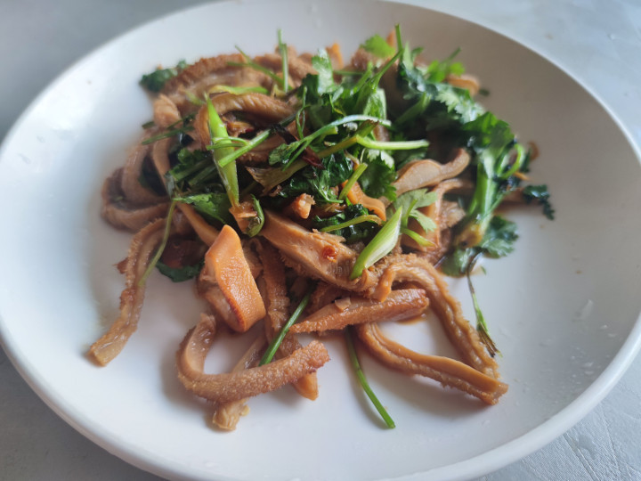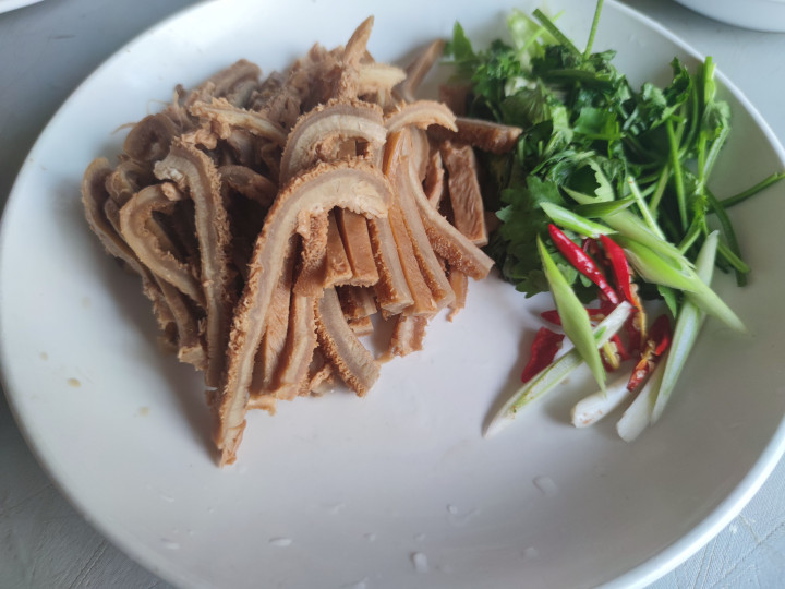 1.煮熟的羊肚切成细条,香菜摘洗干净后切成段,葱姜和干辣椒切成丝。