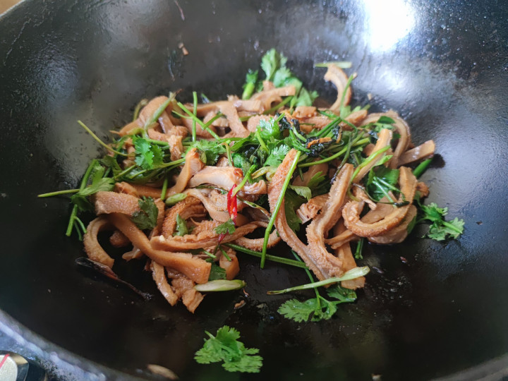3.锅中入油爆香葱姜丝和干辣椒,下入羊肚翻炒均匀,烹入料酒、一品鲜酱油和蚝油炒匀,然后撒入香菜段,加入盐和胡椒粉调味,翻炒均匀后滴几滴香油即可出锅享用。