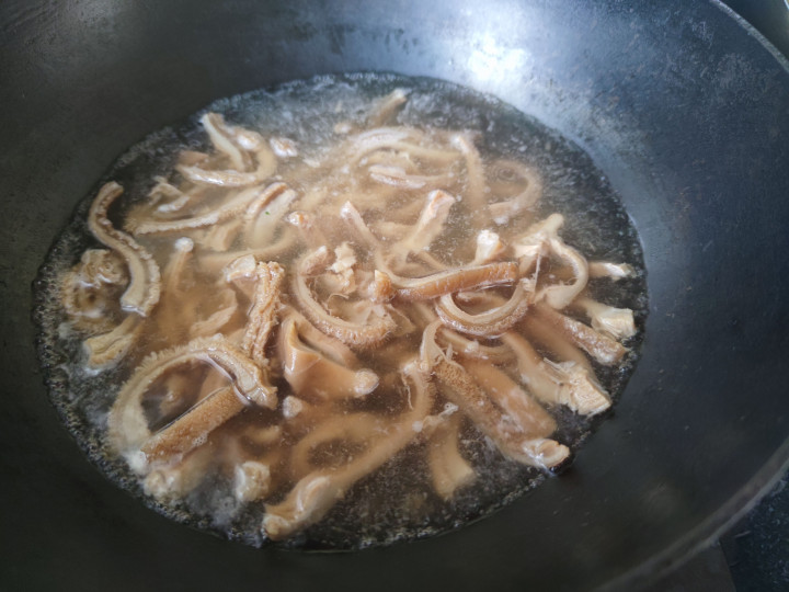 2.锅中烧水,水中加入几滴料酒,水开后下入羊肚焯烫去异味和油脂,捞出来漂洗干净。